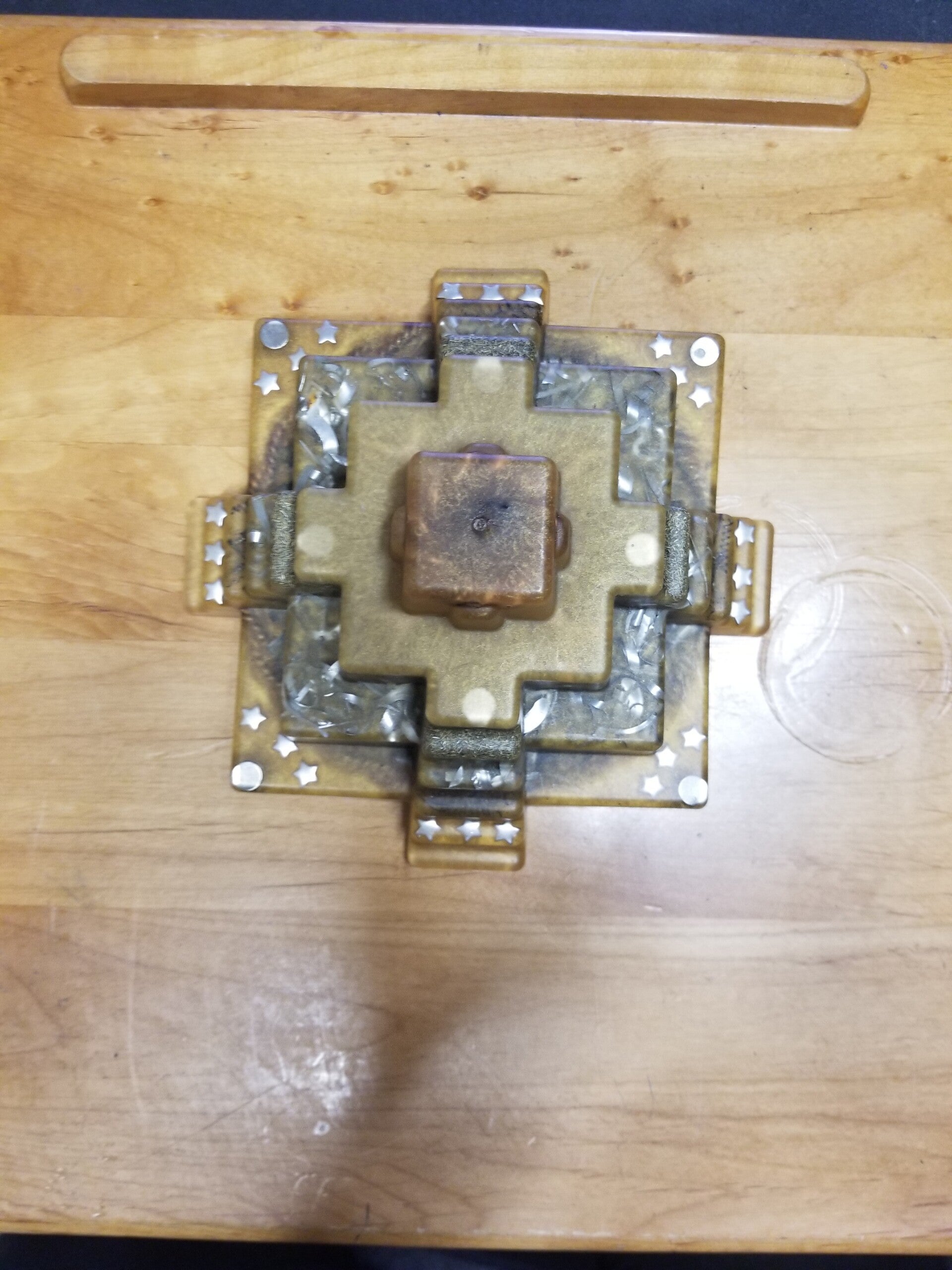Adorned with star-shaped decorations and metallic accents, this pyramid is not only a visual masterpiece but also a symbol of cosmic connection and timeless artistry. Perfect for history enthusiasts, collectors, or anyone drawn to the mystique of Mayan culture, this model serves as a striking centerpiece for any space.